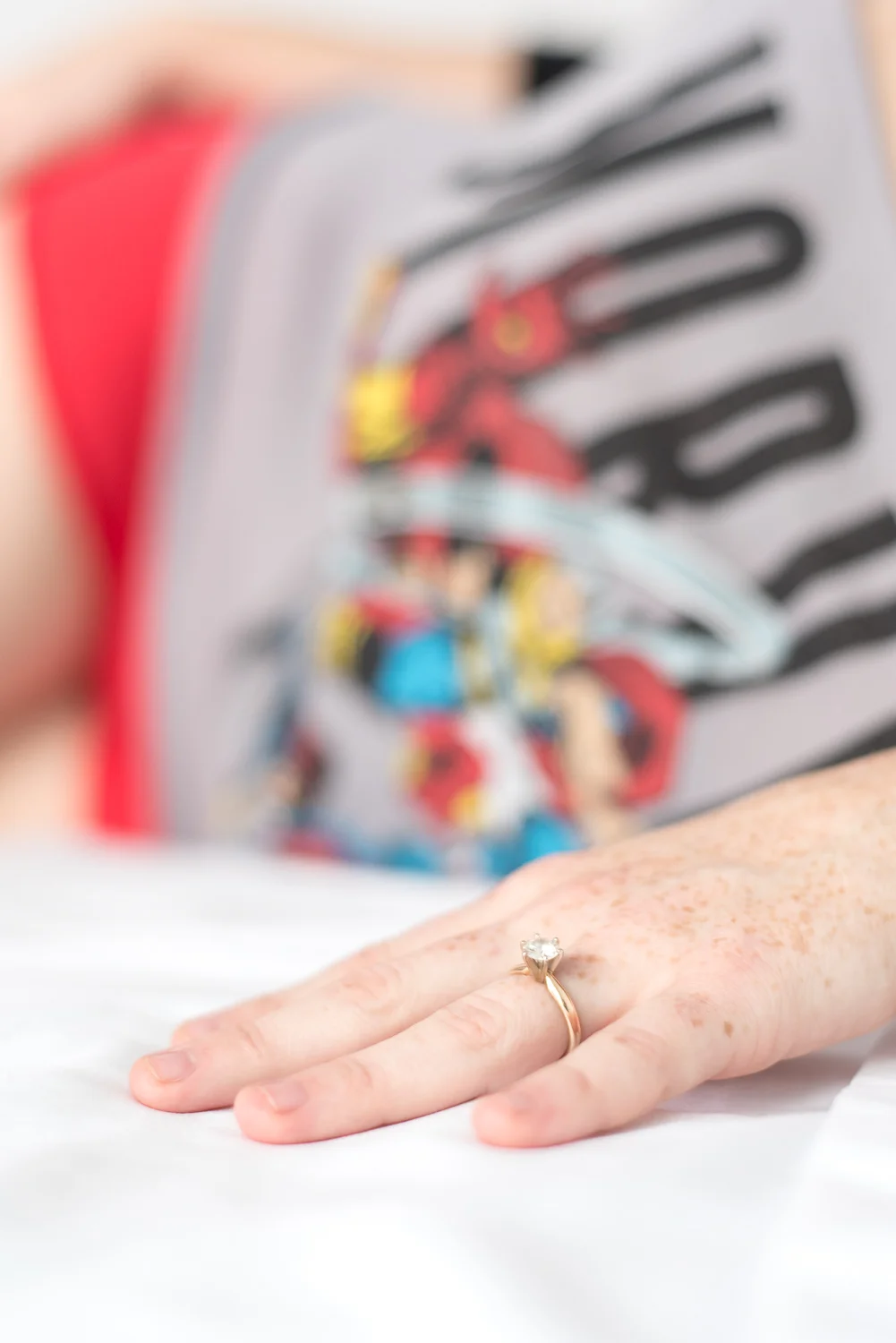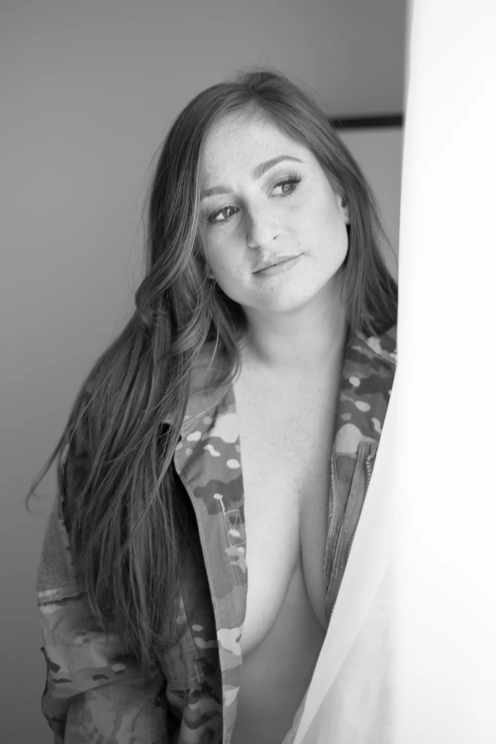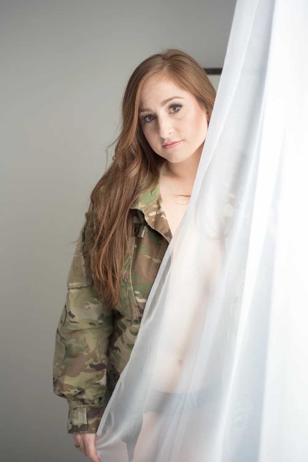 My answer is always the same — of course you can! Boudoir attire is all about what makes you feel the best in your own skin and that varies for each woman. Some non-traditional boudoir ideas include wearing a cozy sweater, a furry throw, a uniform, or even a cut up t-shirt of your husband's favorite superheroes.